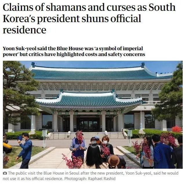 영국을 대표하는 언론 중 하나로 꼽히는 <가디언>은 10일 "Claims of shamans and curses as South Korea's president shuns official residence"라는 제목으로 청와대 개방 소식을 보도했다.