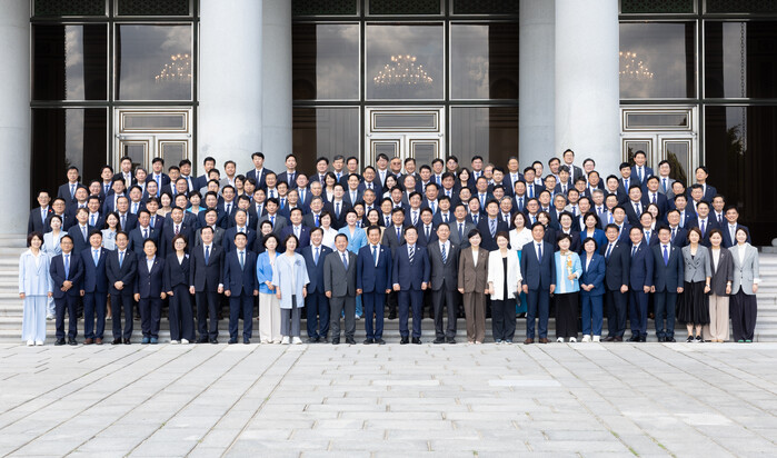 | ▲ 이재명 대통령이 29일 청와대 영빈관에서 열린 더불어민주당 의원 초청 오찬에 참석한 의원들과 기념촬영을 하고 있다. 2025.8.29 (사진=연합뉴스) |