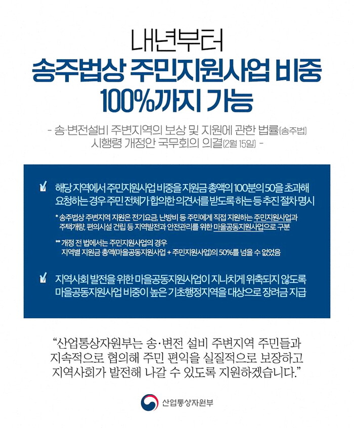 산업부는 “이번 송주법 시행령 개정사항을 반영한 「지원사업계획 수립지침」을 수립하여 내년에 집행될 금년도 사업부터는 개선된 지원사업 절차에 따라 차질없이 추진하도록 하겠다”고 하면서, “그간 송.변전설비 주변지역 중 지리적 특성 및 고령 등의 사유로, 마을공동지원사업의 필요성이 적었던 일부 지역의 지역주민들은 이번 제도개선으로 주민지원사업 비중을 확대할 수 있어, 지원사업에 대한 주민만족도 제고가 예상된다“라고 밝혔다.