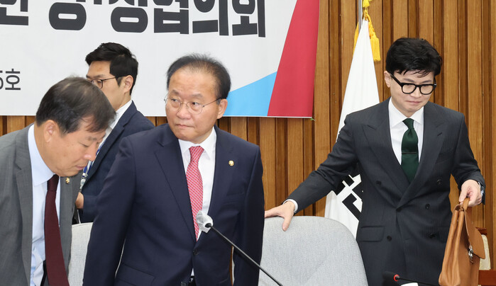 | ▲왼쪽부터 이철규 의원, 윤재옥 원내대표, 한동훈 비대위원장 (사진=연합뉴스) |