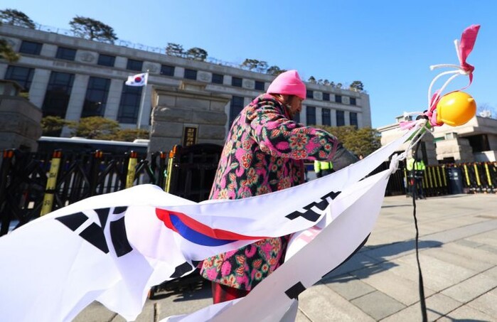 | ▲ 헌재 앞에서 윤석열 탄핵 반대를 외치며 태극기를 들고 가는 모습 (사진=연합뉴스) |