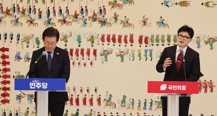 한 대표는 '민주당의 법안 강행처리→대통령의 재의요구권 행사→재표결→법안 폐기→재발의'가 되풀이되는 점을 지적한 뒤 "이런 악순환을 끊어내자. 오늘 정쟁 중단을 선언하고 미래지향적 정치개혁 비전에 전격 합의하자"고 요구했다.