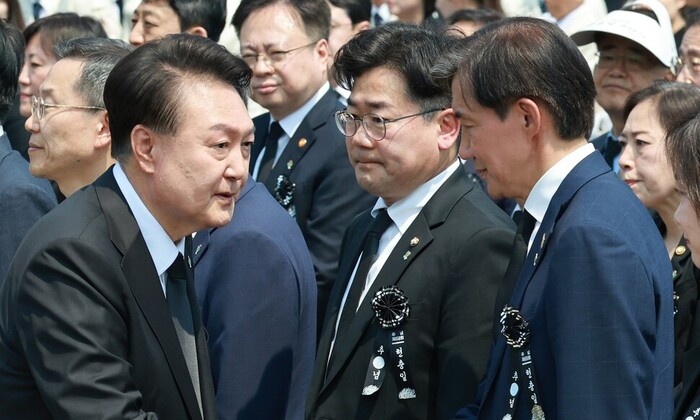| ▲ 제69회 현충일 추념식에 참석한 윤 대통령이 조국 대표와 악수하고 있다(사진=연합뉴스) |