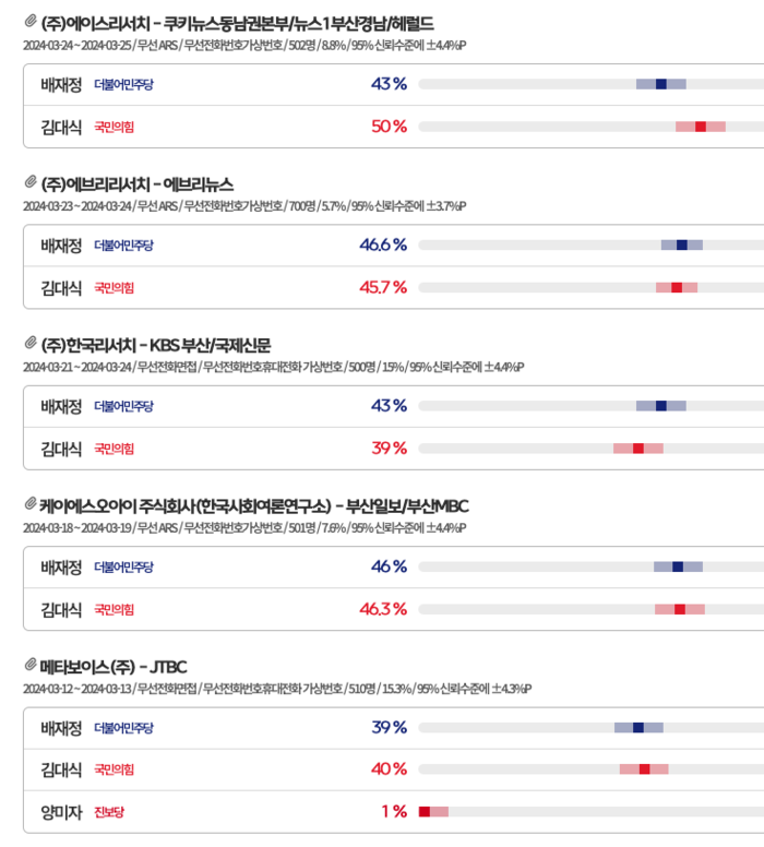 이미 여섯번의 여론조사가 진행됐고 장제원 의원의 대리인이라고 해도 과언이 아닌 국민의힘 김대식 후보가 여전히 앞서고 있는 것으로 드러난 조사가 많지만 결과가 뒤집힌 곳도 많거니와 이번처럼 선두가 바뀐 경우도 있다.