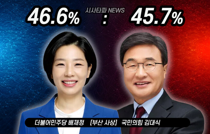 에브리뉴스의 의뢰로 에브리리서치가 23일과 24일 양일간 지역에 거주하는 700명을 대상으로 무선전화번호 가상번호로 여론 조사를 진행한 결과 배재정 46.6%, 김대식 45.7%로 조사됐다.
