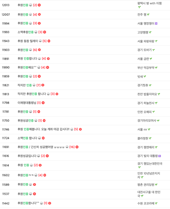 | ▲ 15일, 후원인증 게시글 잇따르는 예비후보 이재명 캠프 공식 카페 (출처=이제부터 진짜 대한민국) |