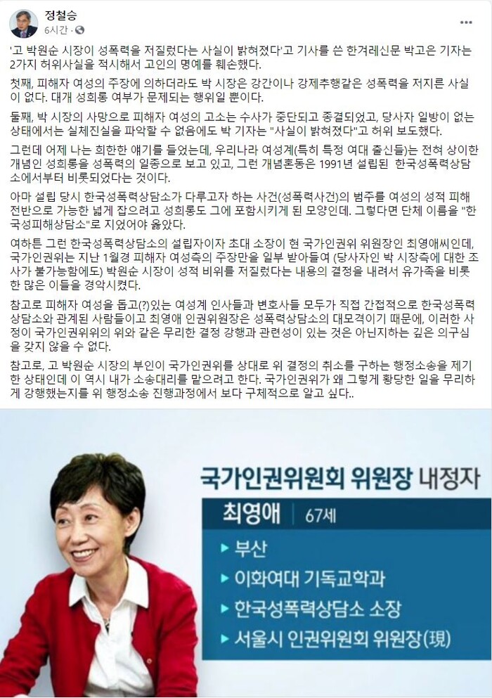여하튼 그런 한국성폭력상담소의 설립자이자 초대 소장이 현 국가인권위 위원장인 최영애씨인데, 국가인권위는 지난 1월경 피해자 여성측의 주장만을 일부 받아들여 (당사자인 박 시장측에 대한 조사가 불가능함에도) 박원순 시장이 성적 비위를 저질렀다는 내용의 결정을 내려서 유가족을 비롯한 많은 이들을 경악시켰다.