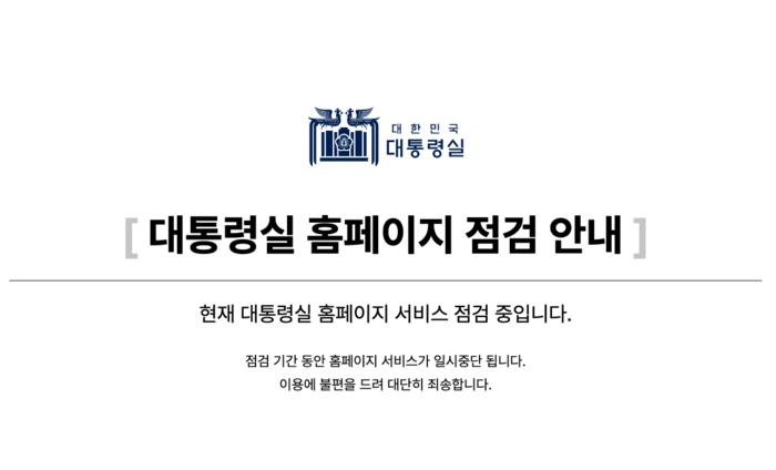 대통령실 홈페이지는 이날 운영이 중단됐다. 대통령실 홈페이지에 접속하면 '현재 대통령실 홈페이지 서비스 점검 중입니다. 점검 기간 동안 홈페이지 서비스가 일시중단됩니다'라는 안내문만 확인할 수 있다.