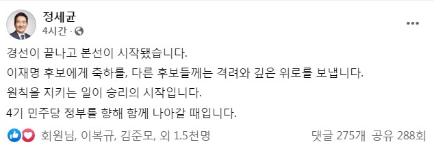 정 전 총리는 페이스북에 “경선이 끝나고 본선이 시작됐다”며 “이재명 후보에게 축하를, 다른 후보들께는 격려와 깊은 위로를 보낸다”고 했다. 그러면서 “원칙을 지키는 일이 승리의 시작”이라면서 “4기 민주당 정부를 향해 함께 나아갈 때”라고 썼다.