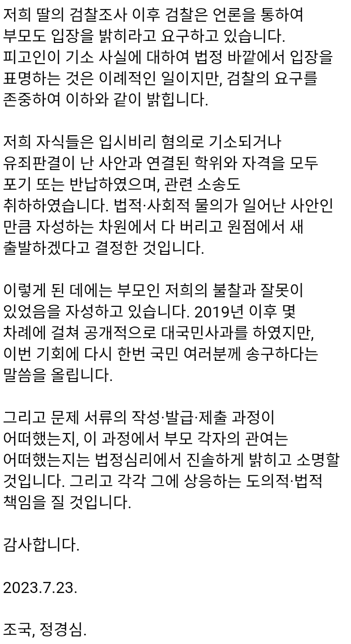 다만 입시비리 혐의의 구체적인 사실관계 및 공모 여부 등에 대해서는 "문제 서류의 작성·발급·제출 과정이 어떠했는지, 이 과정에서 부모 각자의 관여는 어떠했는지는 법정 심리에서 진솔하게 소명하고, 그에 상응하는 도의적·법적 책임을 질 것"이라고 밝혔다.