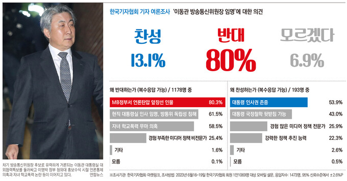 조사에 참여한 현직 기자 1473명 중에서 80.0%가 “이동관 방통위원장 임명에 반대한다”고 응답했다. 구체적으로 ‘적극 반대한다’는 의견은 62.5%였고, ‘반대한다’는 응답은 17.5%로 나타났다.