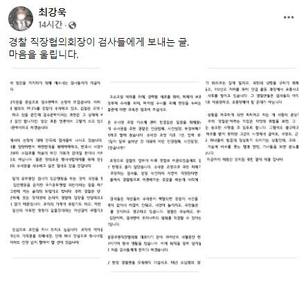 최 의원은 이날 페이스북에 "경찰직장협의회장이 검사들에게 보내는 글"이라며 민관기 경찰공무원직장협의회 위원장이 올린 글을 공유했고, 가슴을 울린다고 전했다.