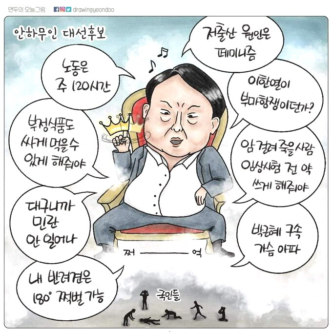 윤석열 예비후보는 기존 망언을 새로운 망언으로 덮고 있습니다. 새로운 이슈로 기존 잘못을 덮는 특수부 검사 방식인 것 같습니다. 주 120시간 노동발언, 부정식품 발언도 모자라서 “후쿠시마 원전은 방사능 유출이 안 됐다”라는 망언을 했습니다. 이런 주장은 올림픽을 통해 후쿠시마 부흥을 기원하는 일본 조차도 하지 않는 주장입니다. 일본 극우도 어리둥절할 일입니다.