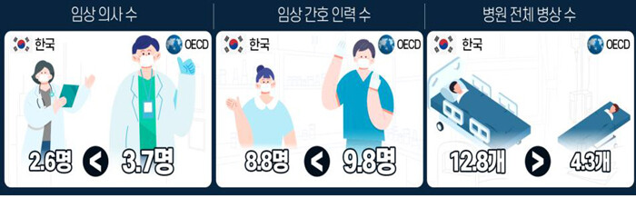 반면 의사 수는 OECD 평균 의사 수보다 적었다.