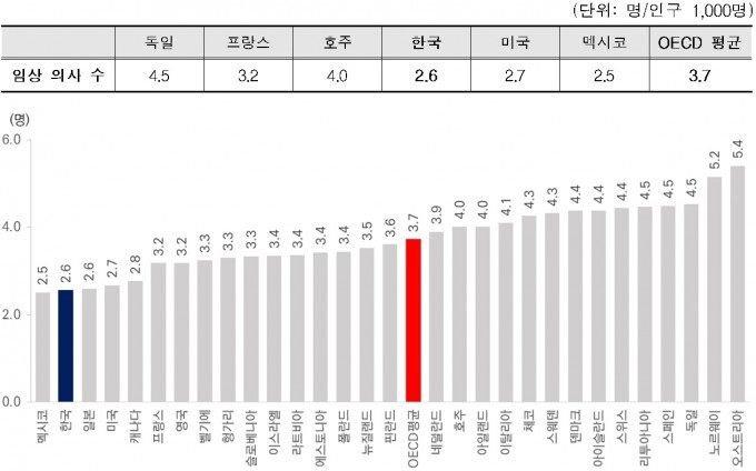 OECD 회원국 인구 1000명당 평균 의사 수는 2011년 3.2명에서 2021년 3.7명으로 증가했다. 한국 의사 수도 같은 기간 2.0명에서 2.6명으로 늘었지만 OECD 평균(3.7명)에는 못 미쳤다.