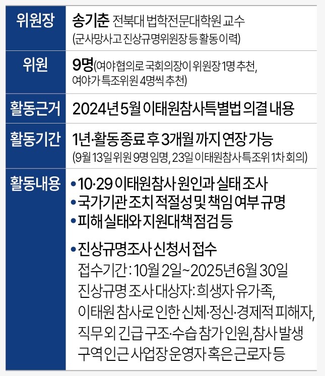 이어 참사 원인과 실태 조사, 국가기관 조치 적절성 및 책임 여부 규명, 피해 실태와 지원대책 점검 등을 해나가겠다고 밝히며 "활동을 통해 사회적 논란을 종식시키고 삶의 모든 영역에서 자유롭고 안전한 공동체를 회복하고자 한다"고 말했다.