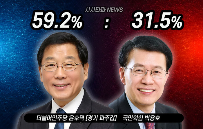 조사 결과 더불어민주당 윤후덕 59.2%, 국민의힘 박용호 31.5%, 없다 4.1%, 잘모름 5.3% 순으로 윤후덕후보가 오차범위를 넘어 앞서는 것으로 조사됐다.