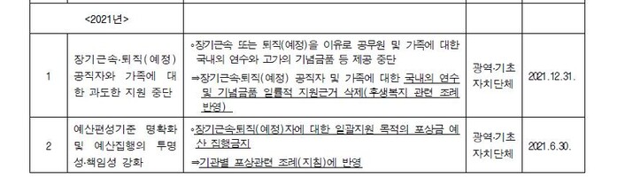 2021년에도 장기근속 또는 퇴직을 이유로 공무원 및 가족에게 국내외 연수와 고가의 기념금품 등 과도한 지원을 제공하는 관행을 중단하고, 관련 조례에서 근거를 삭제하라고 거듭 권고했다.