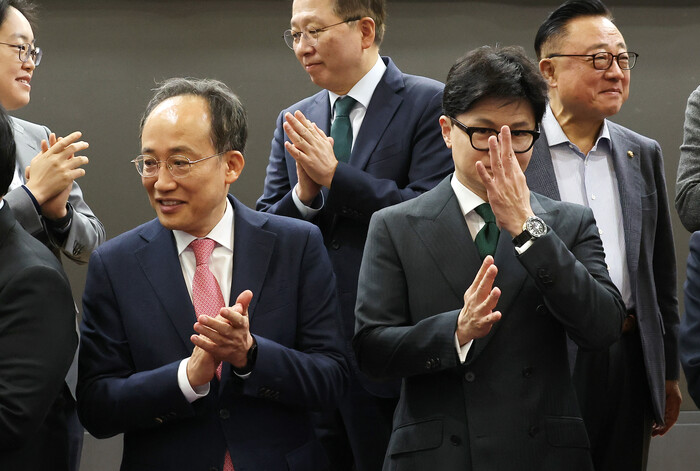 | ▲ 26일 초선 공부모임 참석한 추경호 국민의힘 원내대표와 한동훈 대표 (사진=연합뉴스) |