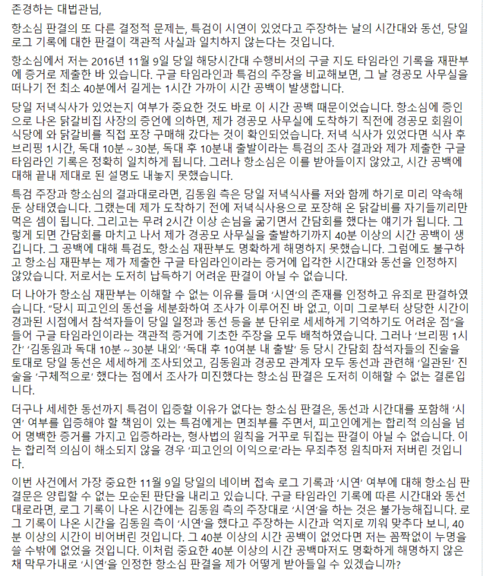 그렇게 되면 간담회를 마치고 나서 제가 경공모 사무실을 출발하기까지 40분 이상의 시간 공백이 생깁니다. 그 공백에 대해 특검도, 항소심 재판부도 명확하게 해명하지 못했습니다. 그럼에도 불구하고 항소심 재판부는 제가 제출한 구글 타임라인이라는 증거에 입각한 시간대와 동선을 인정하지 않았습니다. 저로서는 도저히 납득하기 어려운 판결이 아닐 수 없습니다.