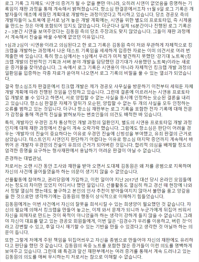 로그 기록이 나온 시간을 김동원 측이 ‘시연’을 했다고 주장하는 시간과 억지로 끼워 맞추다 보니, 40분 이상의 시간이 비어버린 것입니다. 그 40분 이상의 시간 공백이 없었다면 저는 꼼짝없이 누명을 쓸 수밖에 없었을 것입니다. 이처럼 중요한 40분 이상의 시간 공백마저도 명확하게 해명하지 않은 채 막무가내로 ‘시연’을 인정한 항소심 판결을 제가 어떻게 받아들일 수 있겠습니까?