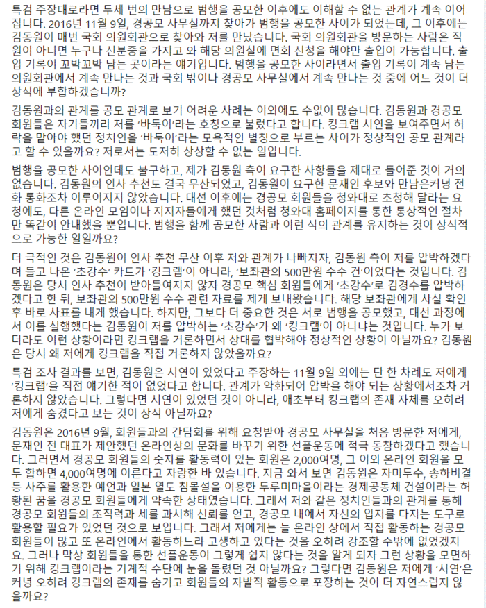 그러나 특검 조사 결과 그 어디에도 제가 김동원과 경공모에 대해 주변에 물어보거나 사전에 조사했다는 얘기는 일체 없습니다. 그냥 만나자마자 ‘묻지마 공모 관계’가 되었다는 특검의 주장은 저로서는 도저히 이해할 수가 없습니다.