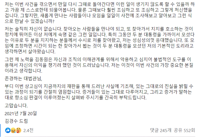 이번 사건 발생 초기부터 지금까지 저는 일관되게 특검과 법원에 ‘사건의 진실을 밝혀 달라’고 간곡하게 요청했습니다. 특검 도입을 먼저 요청한 것도 저였습니다. 특검법상 저와 정치적 입장이 다른 ‘야당 추천’ 특검이 선임될 수밖에 없었지만, 진실을 밝힐 수만 있다면 상관없다고 생각했습니다.