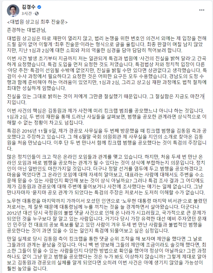 그래야 자신이 대표를 맡고 있는 경공모 회원들에게, 이번 일은 “김경수가 우리를 이용하고, 버린 것”이라고 강변할 수 있고, 후일 다시 재기할 수 있는 기반을 만들 수 있겠다고 생각한 것 아닐까 하는 의문이 듭니다.