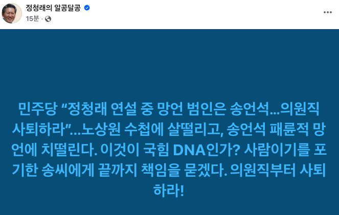 정청래 대표는 자신의 SNS에 “송언석 패륜적 망언에 치 떨린다. 이것이 국힘 DNA인가? 사람이기를 포기한 송씨에게 끝까지 책임을 묻겠다”며 강력히 비판했다.