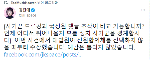 김진애 전 의원은 특히 “드루킹은 언제 어디서 또 튀어나올지 모르는 정치 사기꾼”이라며 정치권은 이를 경계해야 한다고 당부했다. 그리고 이번 사건에서 대법원이 전원합의체를 선택하지 않을 때부터 수상했습니다. 예감은 틀리지 않았다고 트위터에 올렸다.