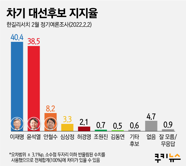 쿠키뉴스 의뢰로 여론조사 전문기관 한길리서치가 지난 2일 전국 18세 이상 성인 1012명에게 ‘차기 대통령 선호도(다자대결)’를 물은 결과 를 획득했다. 둘의 차이는 오차범위 안이다.