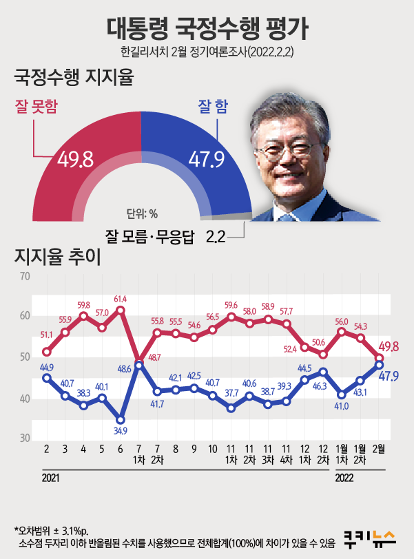 -문 대통령 임기 말에도 ‘철통’ 지지율… 긍정 47.9% vs 부정 49.8%