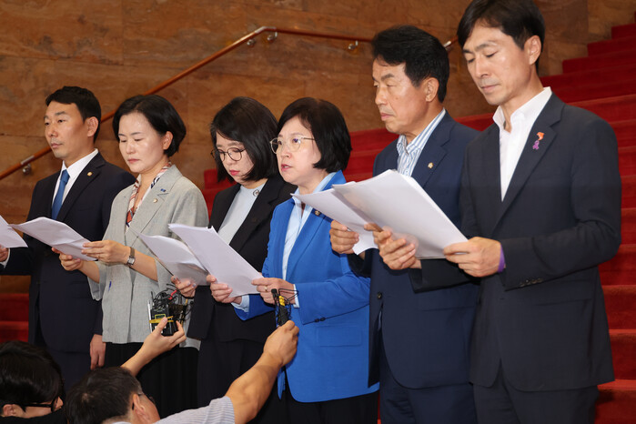 민주당은 조국혁신당·진보당·사회민주당·새로운미래·기본소득당 등 5개 야당과 함께 위원장 탄핵소추안을 발의해 이날 오후 국회 본회의에 보고했다.
