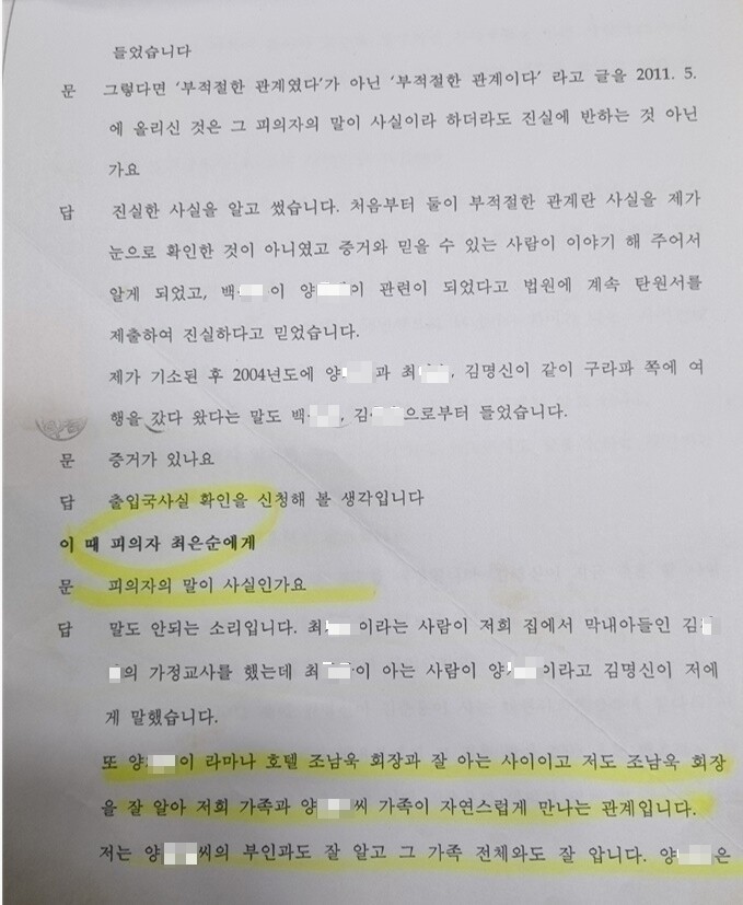 해당조서에서 최은순 씨는 ‘김명신 씨는 아직 결혼하지 않았나’라는 질문에 “2011년 10월 결혼할 예정이다. 지금 결혼할 사람은 ‘라마다 조회장’(삼부토건 조남욱 전회장)이 소개 시켜준 사람으로 2년 정도 교제했다”라고 답했다.