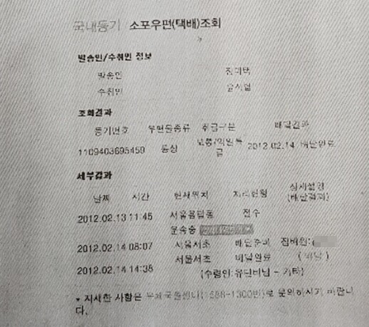 | ▲"서초동 아크로비스타 아파트에서 동거"로 정상송달 "우편 추적조회 화면"/정대택제공 |