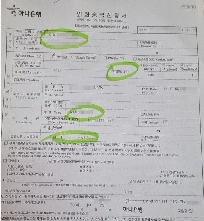 | ▲ 2004년 당시 양재택 검사가 양모 검사 가족에게 보낸 외환송금신청서 /정대택 씨 제공 |