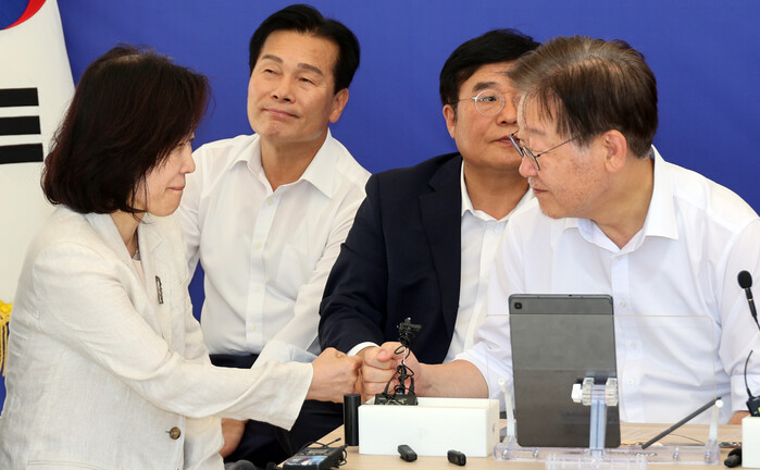 | ▲7일째 단식중인 이재명 대표 단식투쟁 텐트를 찾은 김은경 전 혁신위원장 (사진=연합뉴스) |