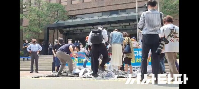 | ▲기자회견중 (신문지 찢기, 계란판 밟기) 퍼포먼스 |