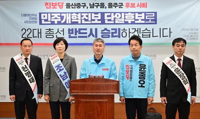 진보당 울산시당은 29일 울산시의회 프레스센터에서 기자회견을 열어 "진보당은 앞서 더불어민주당, 새진보연합과 함께 민주개혁진보연합으로 전국적 반윤석열 총선연대의 결실을 이뤘다"라면서 "이에 울산에서는 중구 천병태, 남구을 조남애, 울주군 윤장혁 후보가 멸사봉공의 마음으로 후보를 사퇴한다"라고 발표했다.