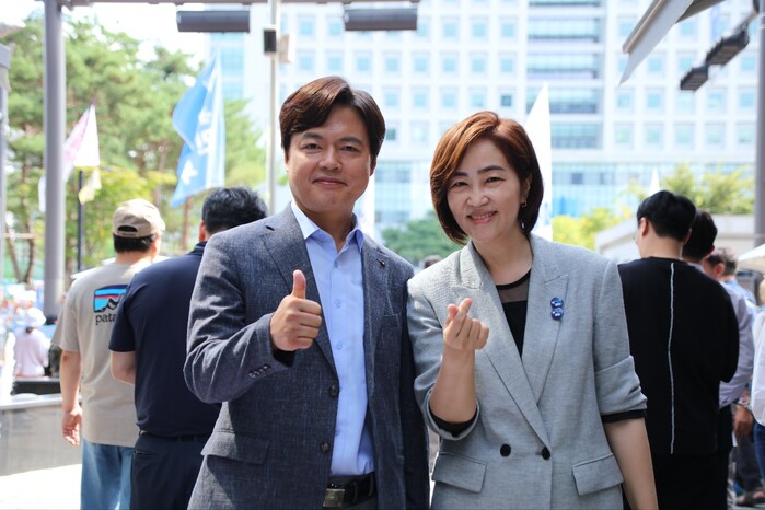 | ▲평택을 김현정 지역위원장과 과천의왕을 준비중인 이은영 소장 (사진=시사타파뉴스 이만우) |