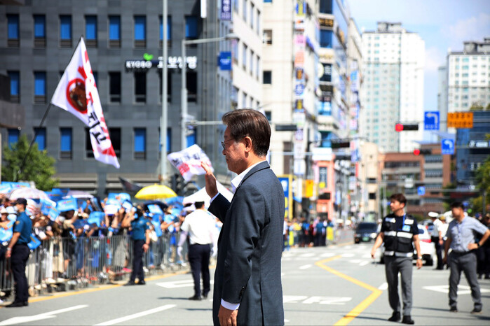 | ▲멀리서 환호하는 시민들에게 답하는 이재명 대표 (사진=시사타파뉴스 이만우) |