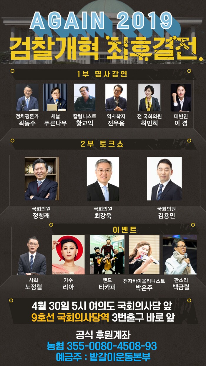 이번 열리는 ‘Again 2019 검찰개혁 최후결전’ 문화제는 오후 5시에 시작하며 1부 명사 강연과 2부 토크쇼로 나누어서 진행된다.
