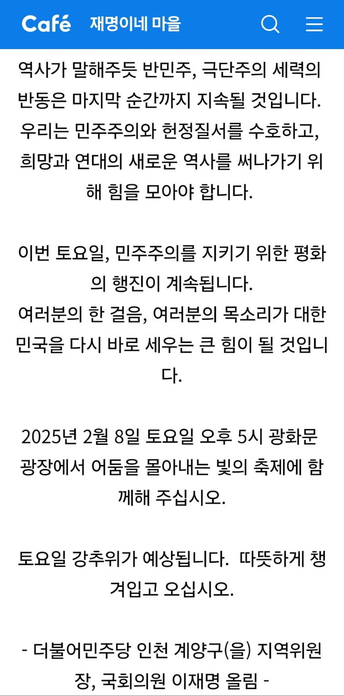 '재명이네 마을' 스탭이 올린 게시글은 이 대표가 지역 당원들에 보낸 문자로 "여러분의 한 걸음, 여러분의 목소리가 대한민국을 다시 바로 세우는 큰 힘이 될 것"이라며 집회 참여를 독려한 내용이다.