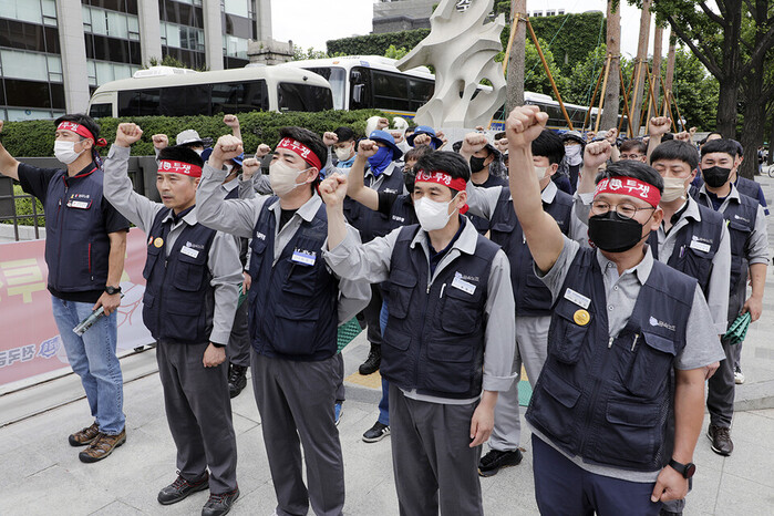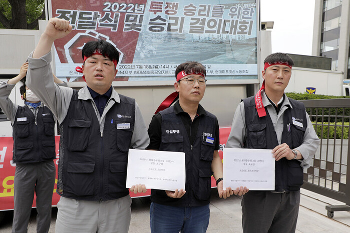 | ▲금속노조 광주전남지부 현대삼호중공업지회와 금속노조 현대중공업지부 그리고 현대미포조선노동조합 등이 7월 18일 오후 서울 종로구 계동 현대 사옥 앞에서 ‘2022년 현중 3사 요구안 전달식과 공동투쟁 승리 결의대회’를 마친 후 조선3사 공동교섭 요구안과 공동교섭의 틀을 논의할 TF구성안을 사측에 전달했다. |