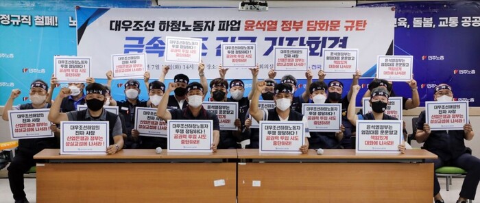 19일 오후 서울 중구 민주노총에서 열린 대우조선 하청노동자 파업 윤석열 정부 담화문 규탄 금속노조 긴급 기자회견을 가졌다.