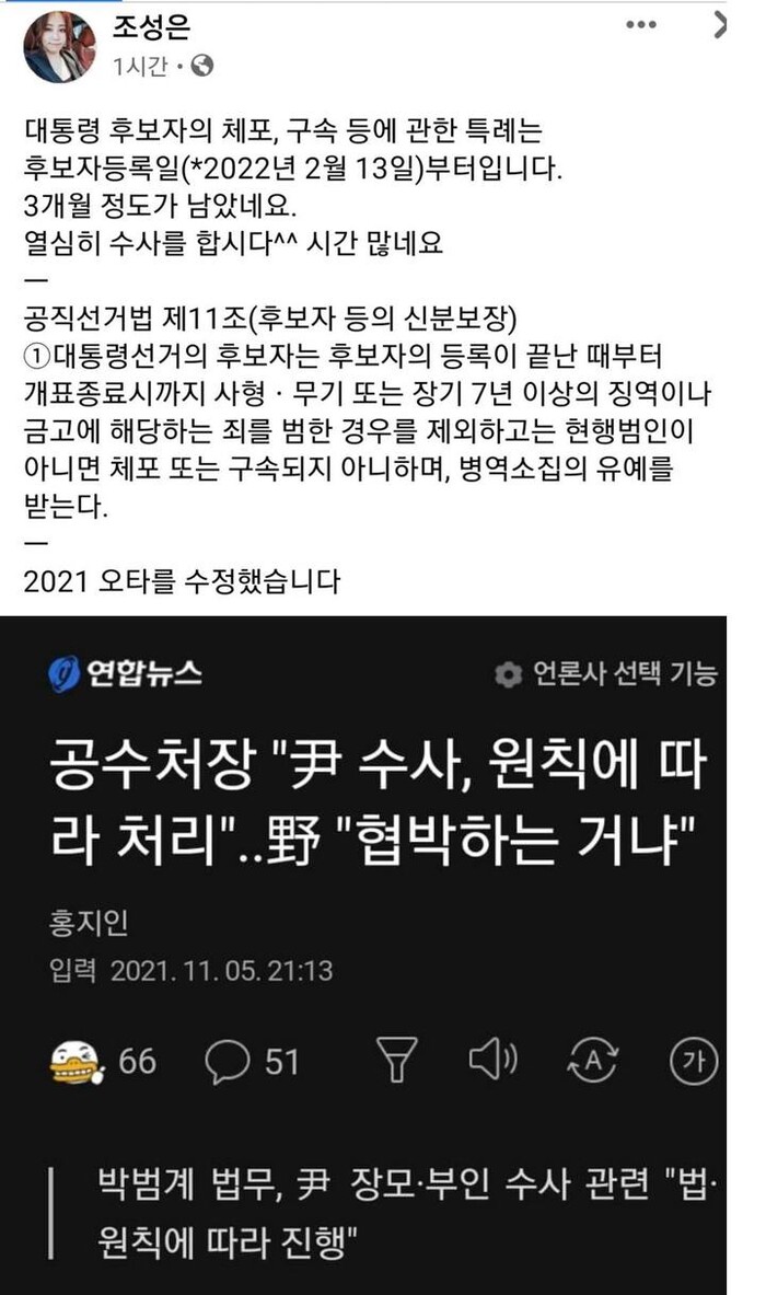 제보자 조성은 씨는 대통령후보자의 체포, 구속등에관한 특례가 3개월 남았다고 하니 '열심히 수사' 하자고 했다.