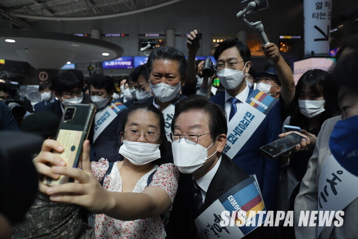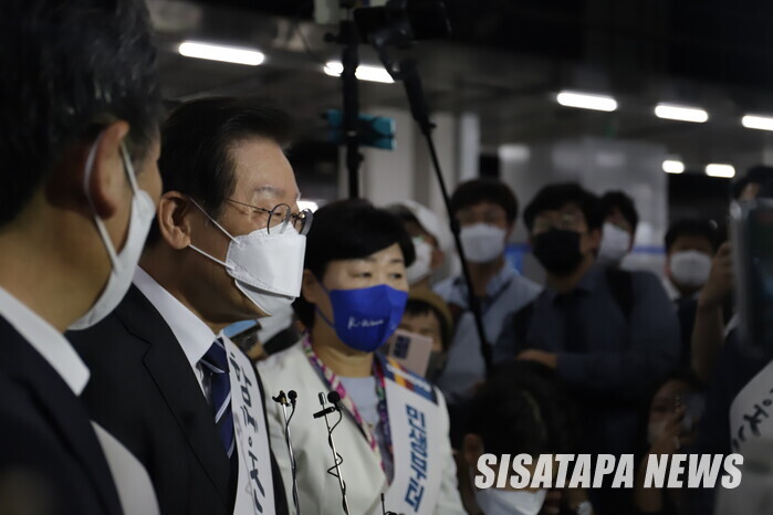 | ▲ 기자 앞에서 짧게 인터뷰를 진행한 이재명 대표 |