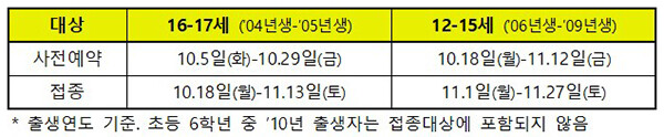 16~17세는 10월 5일부터 29일까지 사전예약을 실시한 후 같은 달 18일부터 11월 13일까지 접종하며, 12~15세는 예약 및 접종 일정을 각각 2주 뒤에 시작한다.