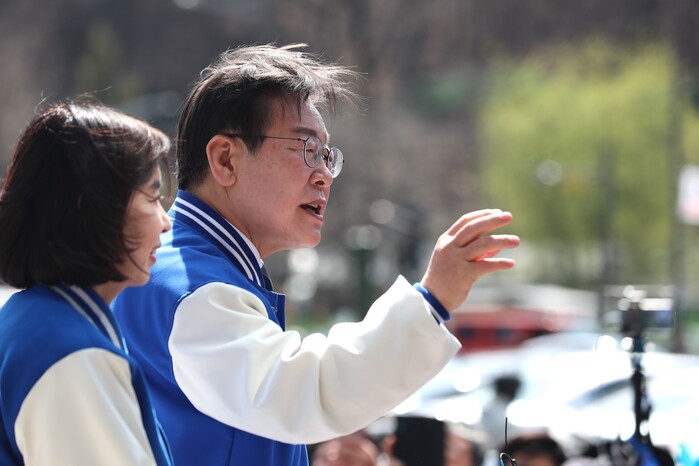 | ▲강남에서 지원유세 연설하는 이재명 대표 (사진=연합뉴스) |