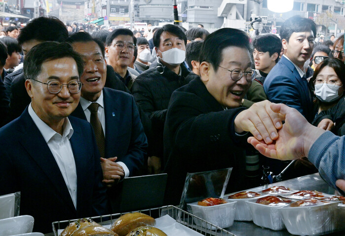 이날 참석자로는 민주당 비명계 플랜B로 주목받는 김동연 지사도 함께 참여했다. 김 지사는 이 대표 바로 옆에서 지역 상인들을 만나 인사를 나눴다. 이날 김 지사와 이 대표의 만남은 민주당의 요청으로 성사됐다.